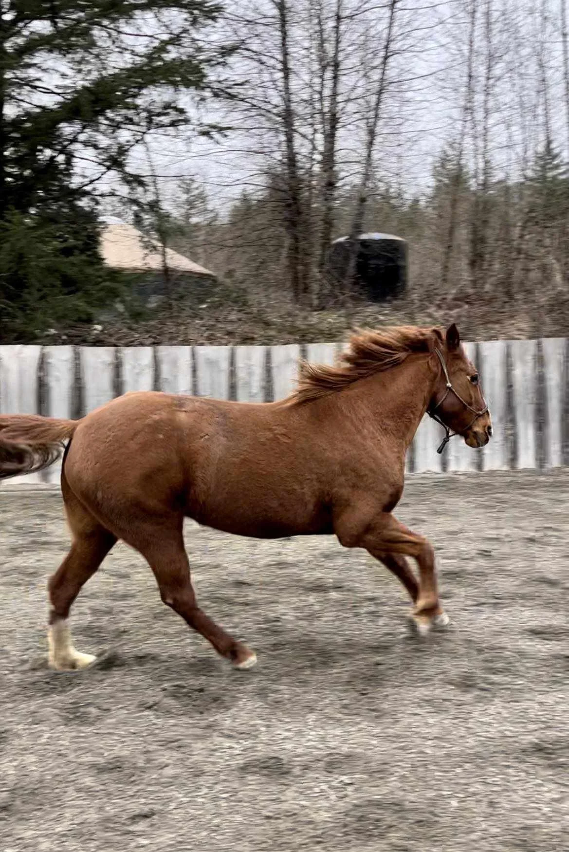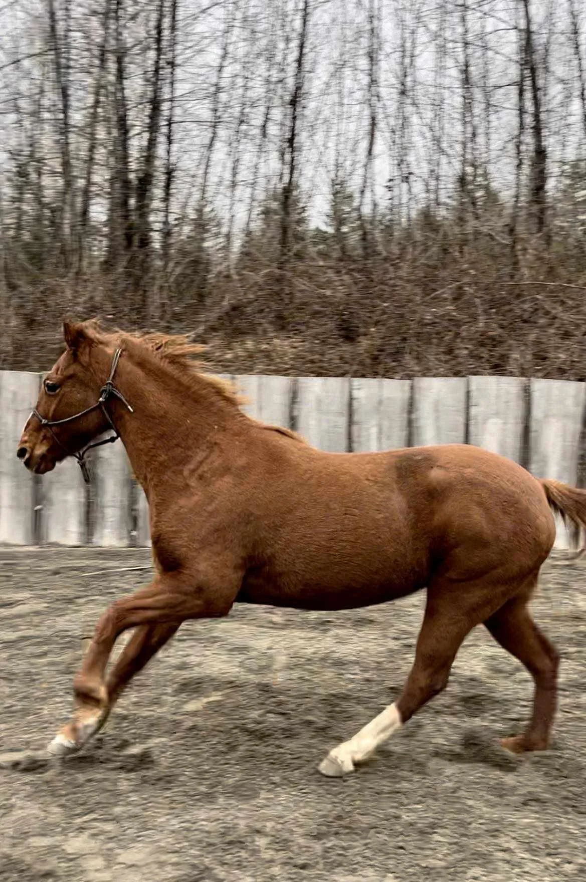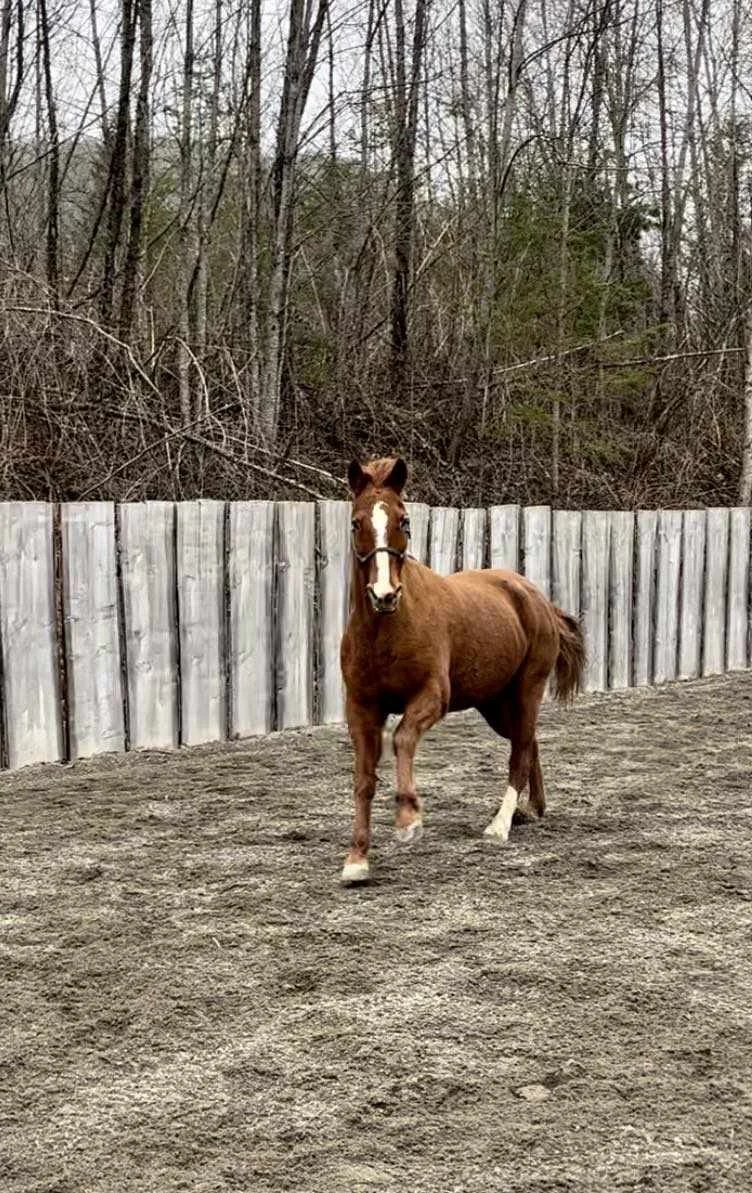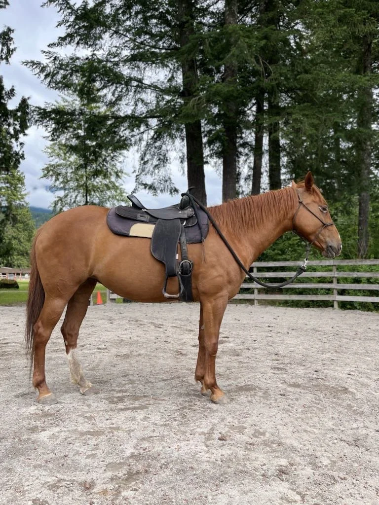 This beautiful chestnut mare came to us with her 7 month old babe by her side from a round up in the interior of BC. She is sensitive, but sweet with a very attentive nature once she has your trust. Piper had been saddled and was doing well but had an injury that kept her from her training for several months. She is all healed and her training is progressing once again and is doing fantastic under saddle . Piper is just shy of 15hh, born in 2011, well built, and would make an excellent trail companion for someone who is experienced and has a calm hand and soft demeanor to bring her along.