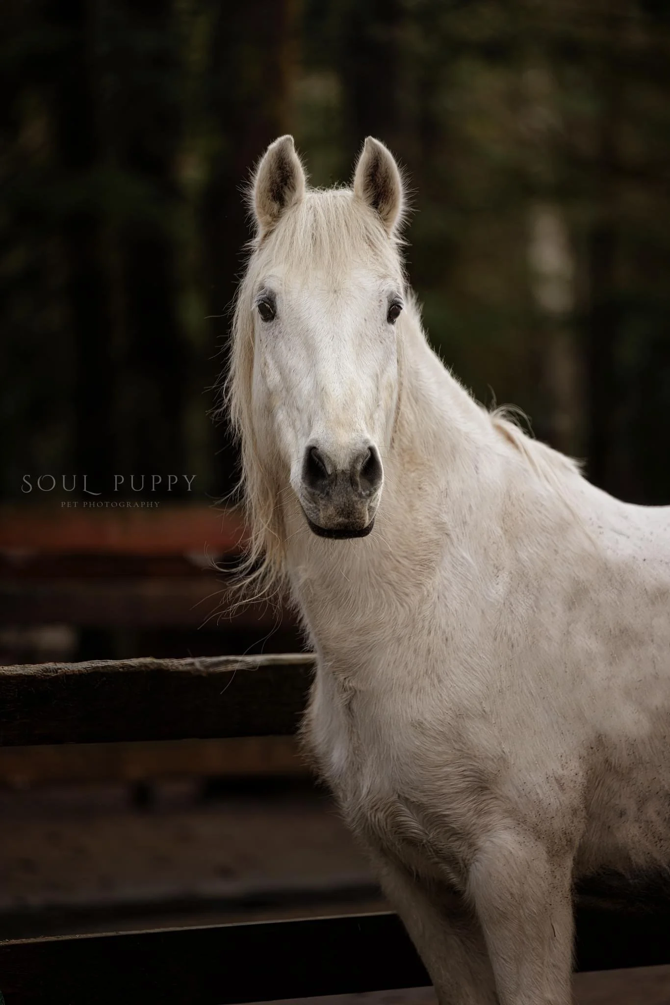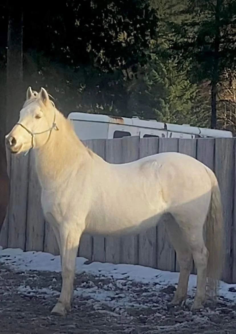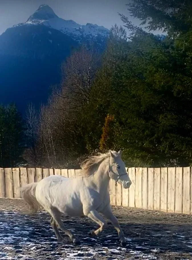 Tiago is an eye catching Andalusian gelding (estimated 20 years old) with a big presence. He is always the first to the fence to say hello and have a good scratch. He arrived at the ranch in the early summer of 2023 with 3 of his herd mates and has proven to have good amount of training behind him. He has an obvious background of dressage training in him with a clear leg yield, half pass and walk pirouette. As he builds strength and muscle we’re sure there will be much more talent to uncover!